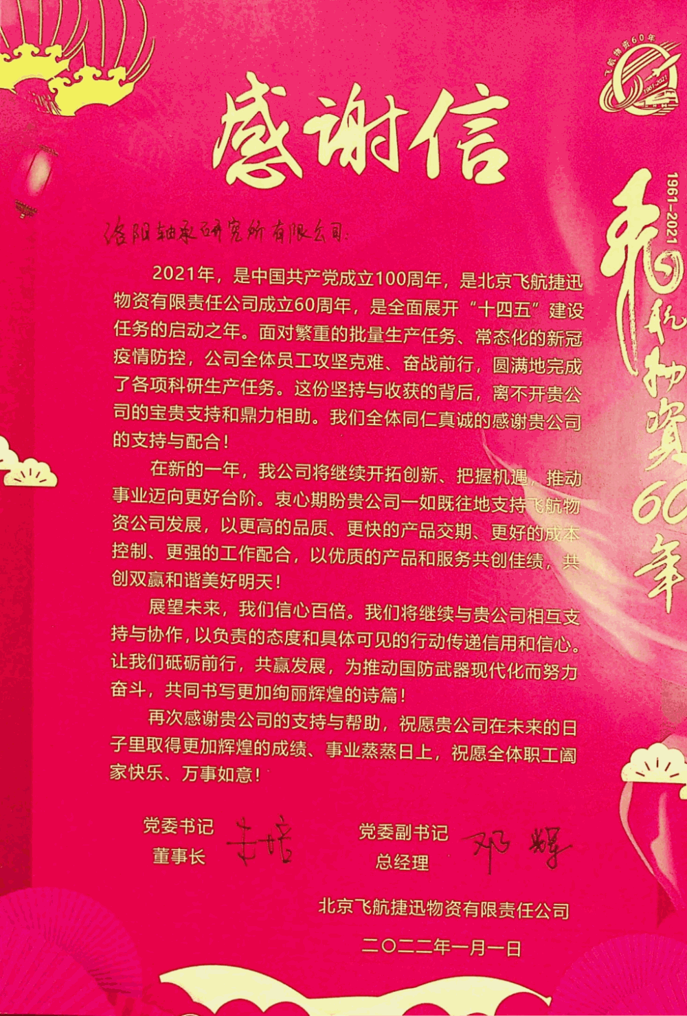新年伊始,萬象更新。洛陽軸承研究所有限公司(簡(jiǎn)稱軸研所)陸續(xù)收到了5封來自航空航天客戶和軍隊(duì)工廠的感謝信。信中對(duì)軸研所長(zhǎng)期以來在軍工科研生產(chǎn)配套任務(wù)和國防武器裝備現(xiàn)代化方面給予的支持和相助表示敬意和衷心的感謝。