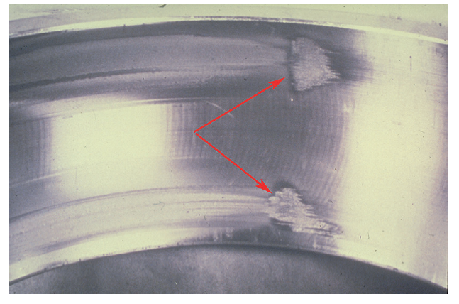 滑傷(skidding):由于高速滑動和因載荷迅速變化而使?jié)櫥湍て屏眩诒砻娉霈F(xiàn)的斷續(xù)的銀霧狀表面損傷。