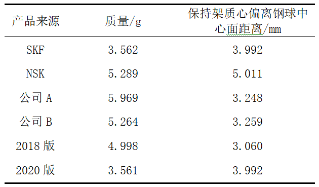 表1 不同公司高速深溝球軸承6307保持架的基礎(chǔ)數(shù)據(jù)對比