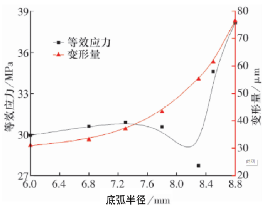 隨著底弧半徑的增大,保持架等效應(yīng)力呈先減小后增大的趨勢,變形量不斷增加。底弧的設(shè)計改變了保持架剛度,提高了保持架柔性,受載荷沖擊時,產(chǎn)生較大變形,使保持架等效應(yīng)力減小。當?shù)谆“霃竭^大時,保持架柔性增大,但去除材料較多,導致相鄰結(jié)構(gòu)壁厚薄弱,保持架等效應(yīng)力增大。