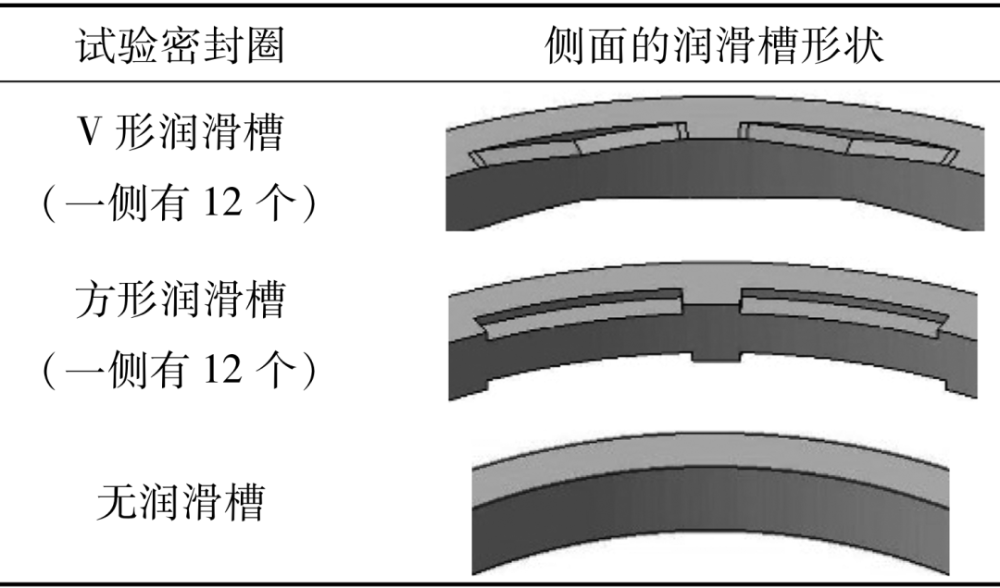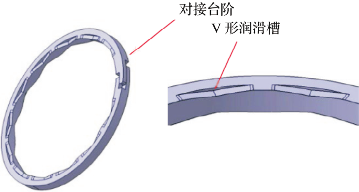 通過在軸槽側(cè)壁上滑動(dòng)的密封圈表面設(shè)置V形潤滑槽,實(shí)現(xiàn)低摩擦力矩密封圈的低摩擦力矩和低漏油。密封圈采用在 PEEK樹脂中加入特殊添加劑制成的 BEAREEPK5301材料,側(cè)面有注塑成型的V形潤滑槽,且對(duì)接臺(tái)階形狀復(fù)雜。通過對(duì)接臺(tái)階的復(fù)雜形狀減少對(duì)接臺(tái)階處的漏油。