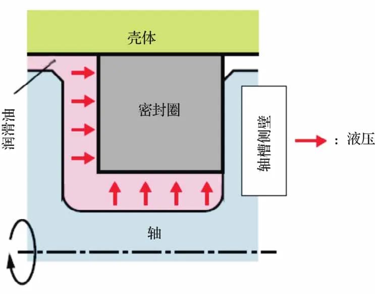 帶矩形橫截面的NTN常規(guī)密封圈的應(yīng)用如圖2所示。由于密封圈與軸槽側(cè)壁的接觸面積小于密封圈與殼體內(nèi)表面的接觸面積,當(dāng)軸或殼體旋轉(zhuǎn)時(shí),軸槽側(cè)壁的滑動(dòng)阻力較小,密封圈在軸槽側(cè)壁上滑動(dòng)。密封圈與軸槽側(cè)壁是面接觸,因此漏油較少。