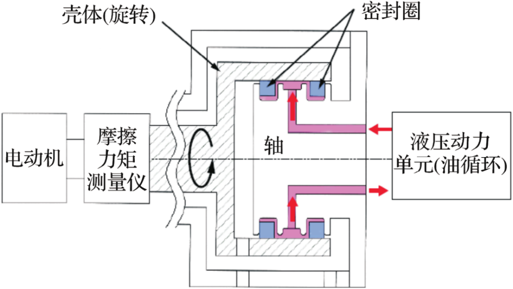 具有不同潤滑槽形狀和無潤滑槽的3種密封圈對(duì)比見表1。試驗(yàn)設(shè)備示意圖如圖3所示。通過安裝在軸槽上的2個(gè)密封圈之間的循環(huán)油施加油壓并旋轉(zhuǎn)殼體,從而實(shí)現(xiàn)摩擦力矩的測量。