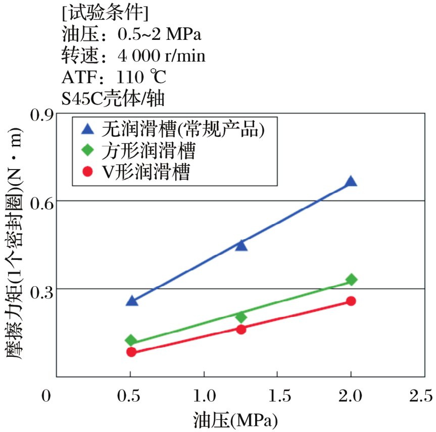 油壓與摩擦力矩的關(guān)系如圖4所示。將測得的2個(gè)密封圈的摩擦力矩除以2得到1個(gè)密封圈的摩擦力矩。帶V形潤滑槽密封圈的摩擦力矩比無潤滑槽密封圈(NTN的常規(guī)產(chǎn)品)的低60%~70%,比帶方形潤滑槽密封圈的低20%。