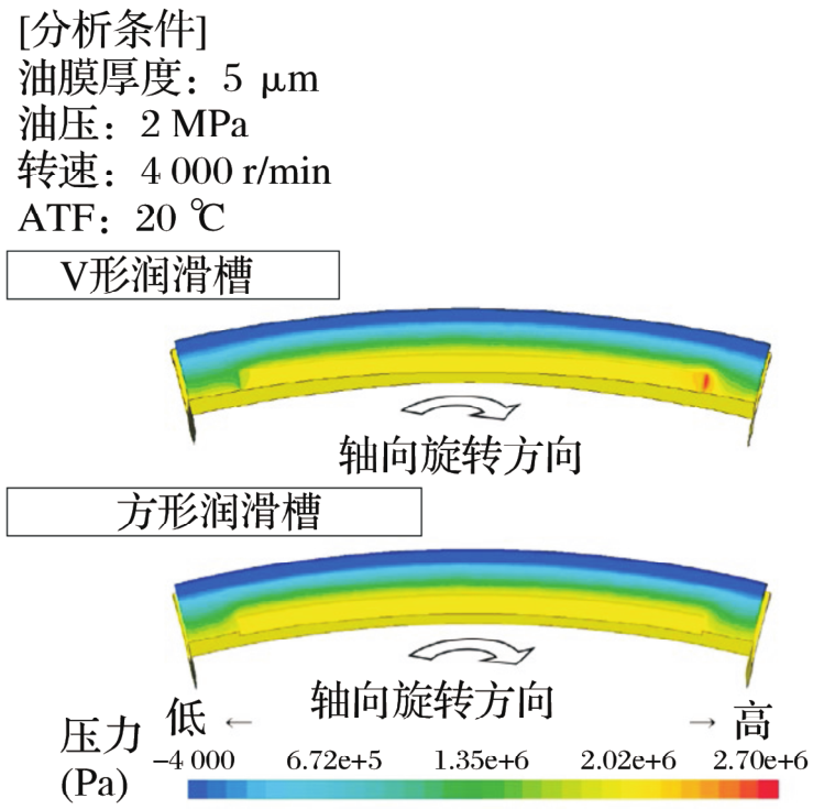 1個(gè)潤滑槽流體區(qū)域模型的分析結(jié)果如圖5所示。采用V形潤滑槽時(shí),由于流體動(dòng)力效應(yīng),潤滑槽一端的油膜壓力高。油膜壓力產(chǎn)生的軸向力與通過油壓將密封圈壓在軸槽側(cè)壁上的力方向相反,因此可減小油壓。還假設(shè)由于壓力差,油從潤滑槽端部流到潤滑槽之間的滑動(dòng)表面,有助于降低摩擦力矩。另一方面,在V形潤滑槽中觀察到的高油膜壓力在方形潤滑槽中觀察不到。