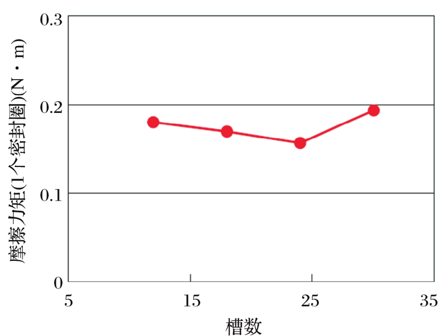 槽數(shù)與摩擦力矩的關(guān)系如圖8所示。槽數(shù)由12向24增加時(shí),摩擦力矩逐漸降低,但槽數(shù)為30時(shí),摩擦力矩增大。測量結(jié)果與前述觀點(diǎn)一致,證明槽數(shù)存在最優(yōu)值。由于槽數(shù)受到設(shè)計(jì)和制造的限制,從而取決于外徑,因此,NTN低摩擦力矩密封圈按照外徑尺寸排列了最優(yōu)數(shù)量的V形潤滑槽。