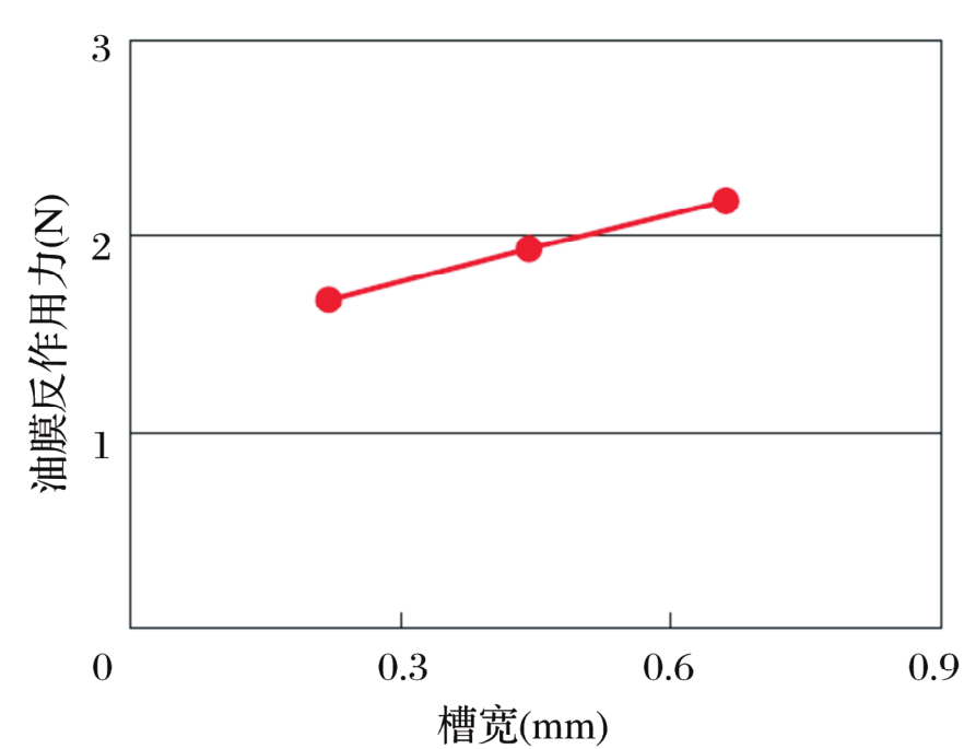 槽寬與油膜反作用力的關(guān)系如圖9所示。驗(yàn)證結(jié)果與估算結(jié)果一致,油膜反作用力隨著槽寬增加而增大,但過大的槽寬會(huì)導(dǎo)致漏油量增大。因此,必須針對(duì)每種情況確定槽寬,要考慮軸和殼體的尺寸、偏心率、密封圈和殼體的磨損量等。