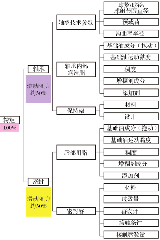 輪轂軸承的轉(zhuǎn)矩由軸承的滾動(dòng)阻力和密封(外部密封和內(nèi)部密封)的滑動(dòng)阻力組成,各占約50%。影響輪轂軸承轉(zhuǎn)矩的各種因素如圖2所示,各種減摩技術(shù)包括:優(yōu)化軸承結(jié)構(gòu)參數(shù)、改進(jìn)軸承內(nèi)部潤(rùn)滑脂來(lái)減少滾動(dòng)阻力;改進(jìn)密封橡膠材料、優(yōu)化密封結(jié)構(gòu)和密封過(guò)盈量來(lái)減少滑動(dòng)阻力。