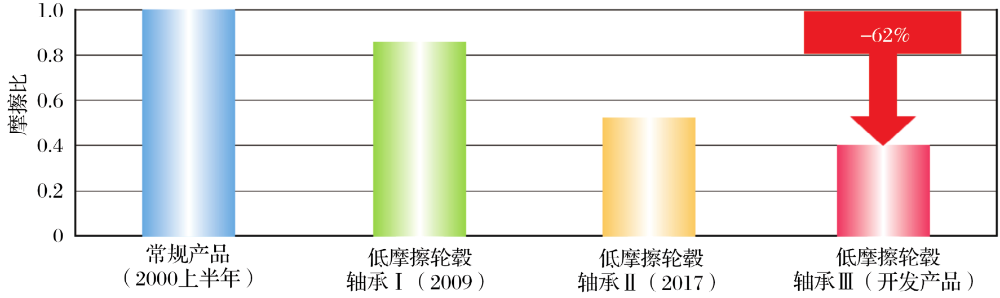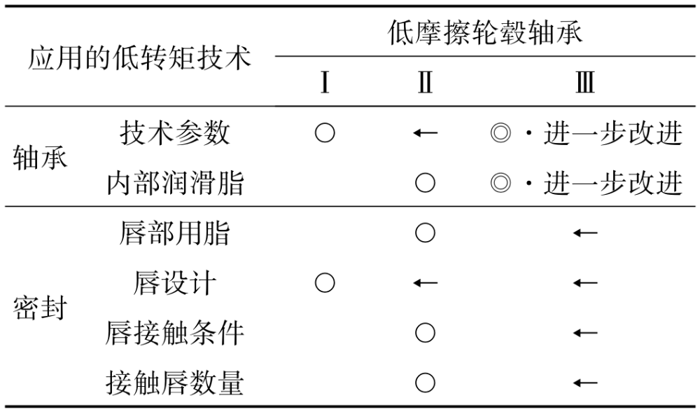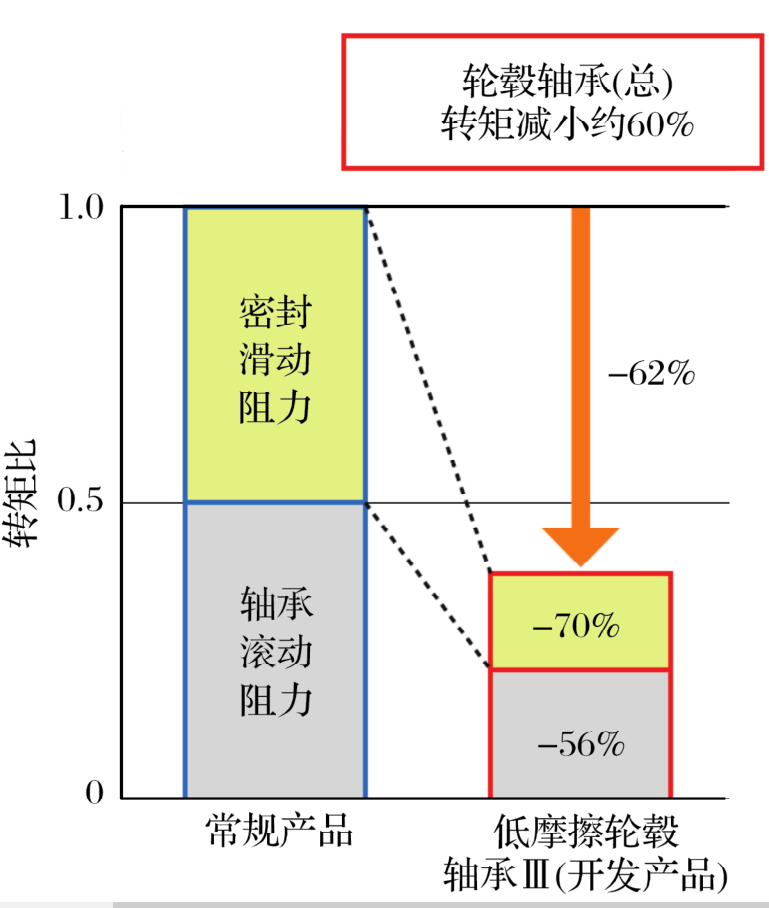 為減小轉(zhuǎn)矩,NTN的輪轂軸承已演變?yōu)榈湍Σ凛嗇炤S承Ⅰ,Ⅱ和Ⅲ。演變概況見表1,相對(duì)于常規(guī)產(chǎn)品的轉(zhuǎn)矩減小比如圖3所示。
