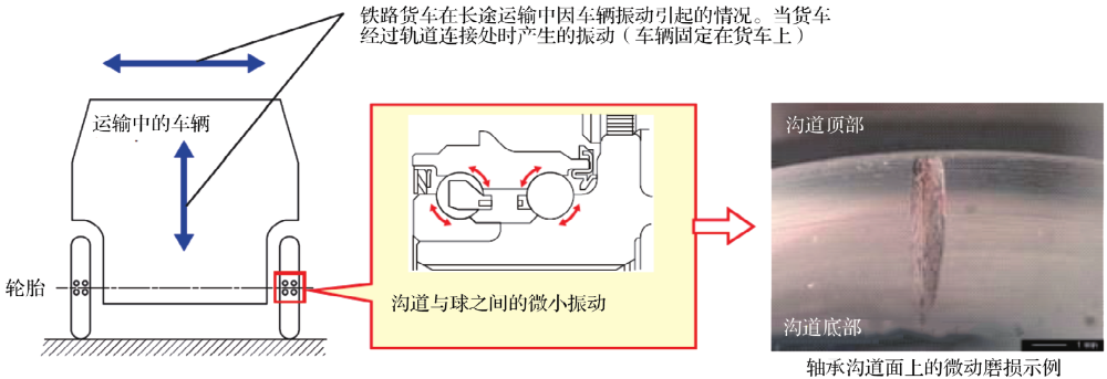 新制造的車輛在鐵路貨車上進(jìn)行長(zhǎng)途運(yùn)輸時(shí),輪轂軸承的溝道與球之間會(huì)產(chǎn)生微小振動(dòng)。如圖4中的箭頭所示,振動(dòng)會(huì)擠壓出溝道與球之間的潤(rùn)滑脂,產(chǎn)生金屬與金屬接觸,導(dǎo)致微動(dòng)磨損。在潤(rùn)滑脂趨于變硬和流動(dòng)性降低的低溫條件下,微動(dòng)磨損更明顯。在這種情況下駕駛車輛可能會(huì)產(chǎn)生異常聲。