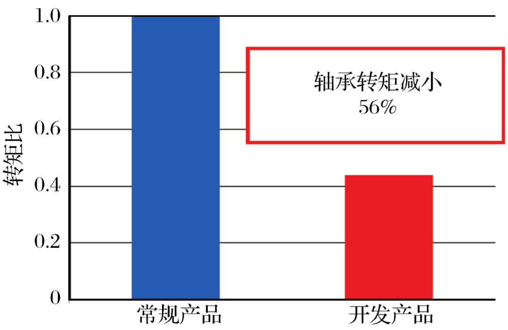 結(jié)果如圖5所示。與常規(guī)產(chǎn)品(最初的第3代輪轂軸承)相比,轉(zhuǎn)矩減小比達(dá)到56%,驗(yàn)證了改進(jìn)軸承內(nèi)部潤(rùn)滑脂后減少滾動(dòng)阻力的效果。