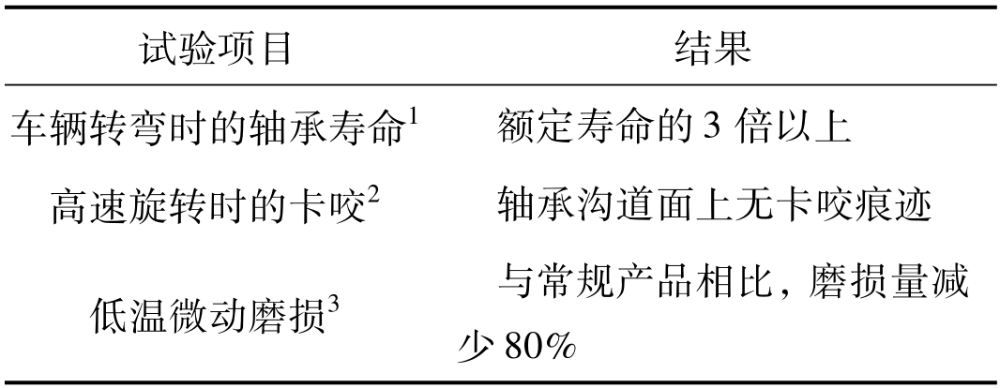 還進(jìn)行了可靠性評(píng)價(jià)試驗(yàn),以驗(yàn)證所需的功能,見表3。填充新潤(rùn)滑脂的軸承滿足了試驗(yàn)項(xiàng)目的所有開發(fā)目標(biāo),實(shí)現(xiàn)了軸承內(nèi)部潤(rùn)滑脂所要求的所有功能。