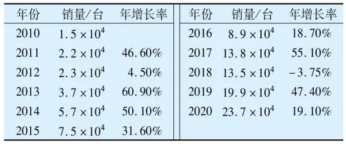 從全球市場角度來看,歐洲和日本是工業(yè)機器人主要供應商,ABB、庫卡(KUKA)、發(fā)那科(FANUC)、安川電機(YASHAWA)占據工業(yè)機器人的主要市場份額,約占全球市場份額的50%。機器人減速器70%以上市場份額由日本納博特斯克(Nabtesco,生產RV減速器)和哈默納科(Har-monic drive,生產諧波減速器)壟斷。由表6可知,我國工業(yè)機器人市場及國產工業(yè)機器人銷量處于高速發(fā)展階段:2014年全國工業(yè)機器人銷售5.7×104臺,國產工業(yè)機器人銷售1.7×104臺,占比29.8%;2016年全國工業(yè)機器人銷售8.9×104臺,國產工業(yè)機器人銷售2.9×104臺,占比32.6% ;2020年全國工業(yè)機器人銷售23.7x104臺,國產工業(yè)機器人銷售8.3×104臺,占比35%。