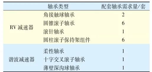 表7 工業(yè)機器人減速器配套軸承種類及數量
