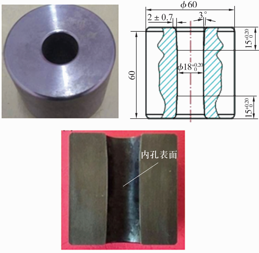 空心滾子試樣材料為GCr15,尺寸為φ60 mm×φ18 mm×60 mm。由于在熱處理過程保護氣氛的作用下,熱處理后可以清晰地看到厚薄不均勻的黑色氧化皮,且去除困難??招臐L子線切割后主要尺寸及內孔表面的氧化皮如圖3所示。