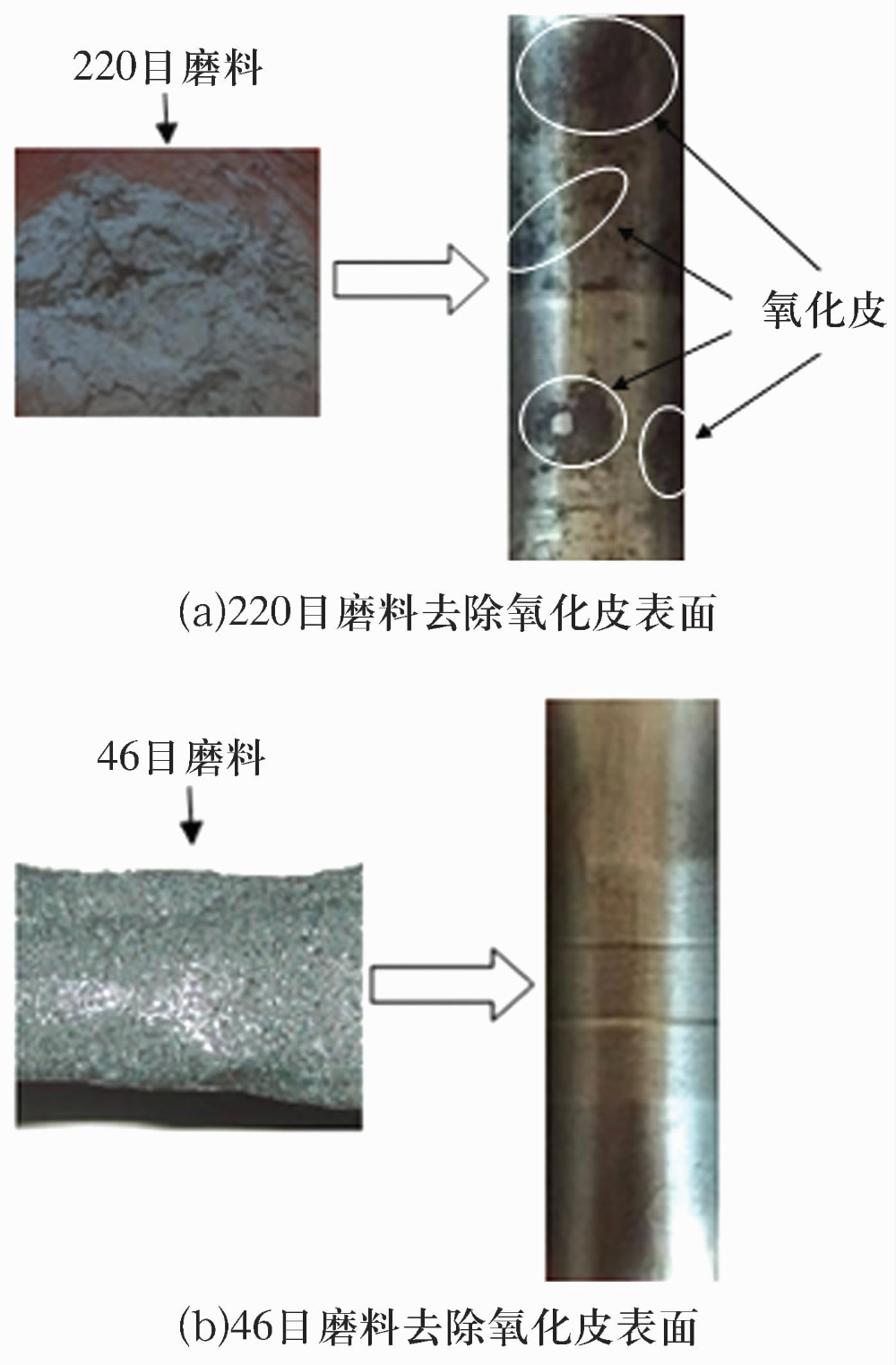 Fig.4 Removal effect of abrasives with different particle sizes on oxide films on bore surface of hollow roller