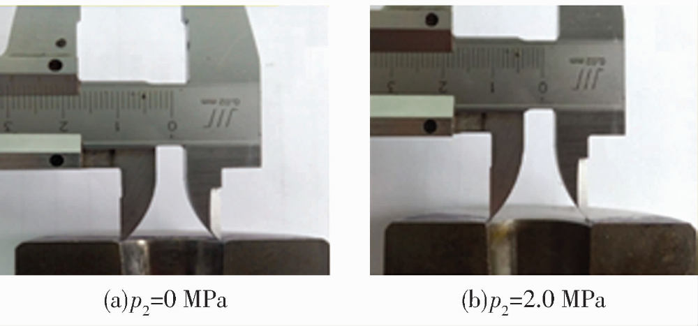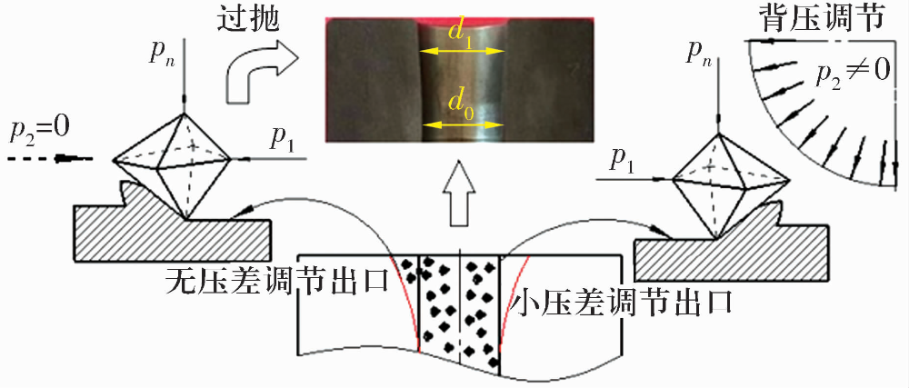 在上述無背壓的“穿膛過”磨粒流加工條件下,將加工后的工件線切割開,可以明顯看出進出口處的尺寸d1,大于中間區(qū)域的尺寸d0,并形成“喇叭口”。出現(xiàn)該結果的主要原因是由于黏彈性磨料在出口處的突然擠入與釋放時形成的擠壓壓力過大,從而在工件兩端出現(xiàn)嚴重的過拋現(xiàn)象,嚴重影響空心滾子的尺寸。為避免“喇叭口”的形成,應該控制進出口的壓差,使磨粒流在加工過程中實現(xiàn)均勻的擠壓運動。因此,在擠壓過程中對磨粒流施加一個回程壓力,即背壓P2與“穿膛過”式(背壓P2為零)的情況相比,在擠壓過程中增加磨料流回程壓力,可以降低壓力在進出口處的突變,實現(xiàn)進出口處壓力的小壓差調節(jié),從而有效抑制“喇叭口”的形成,其原理如圖6所示。