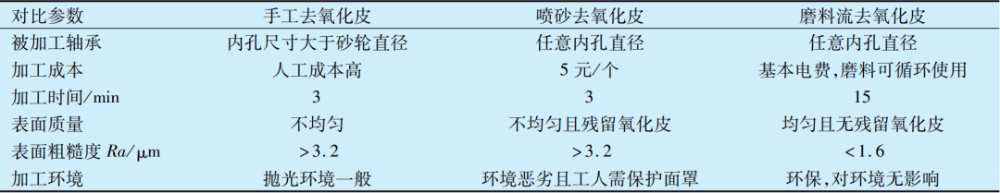 基于上述試驗結果,將磨料流去氧化皮方法與傳統(tǒng)手工和噴砂去氧化皮進行對比,結果見表1,采用磨料流加工方法去除氧化皮的經濟性和加工質量均明顯優(yōu)于其他2種,且磨料流加工法更環(huán)保,但加工效率略低于其他2種。