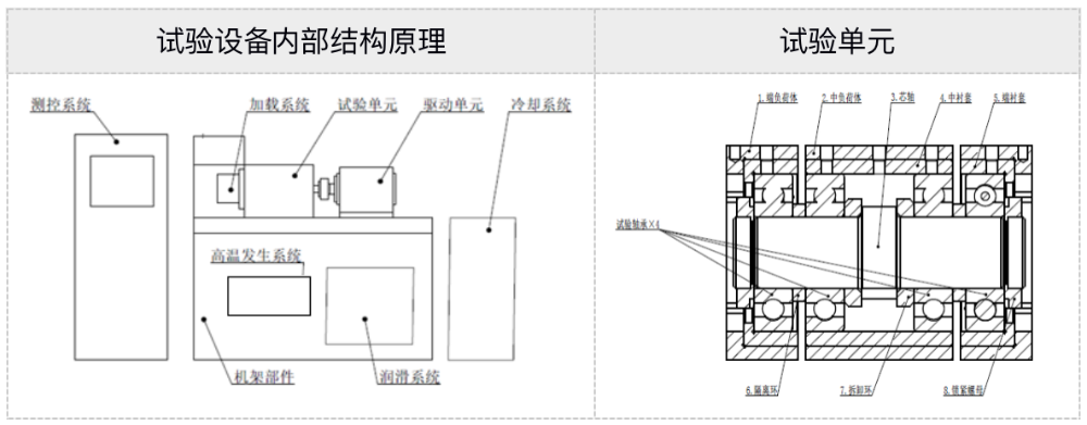 試驗(yàn)機(jī)結(jié)構(gòu)原理圖,包含機(jī)架部件、試驗(yàn)單元、驅(qū)動(dòng)系統(tǒng)、徑向加載系統(tǒng)、軸向加載系統(tǒng)、潤滑系統(tǒng)、冷卻系統(tǒng)、高溫發(fā)生系統(tǒng)、測(cè)控系統(tǒng)等部件組成。