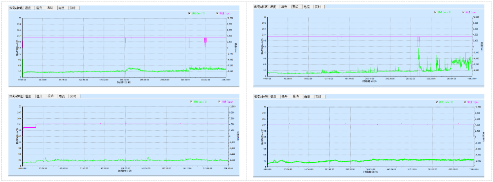 對(duì)整個(gè)試驗(yàn)工裝的振動(dòng)情況進(jìn)行記錄,對(duì)每一時(shí)刻的振動(dòng)值進(jìn)行記錄,在整個(gè)測(cè)試中的振動(dòng)趨勢(shì)變化可以全程跟蹤軸承的狀態(tài),是否出現(xiàn)異常以及異常的趨勢(shì)變化,分析軸承在測(cè)試中哪一階段開始出現(xiàn)異常,是否出現(xiàn)打滑等狀況;