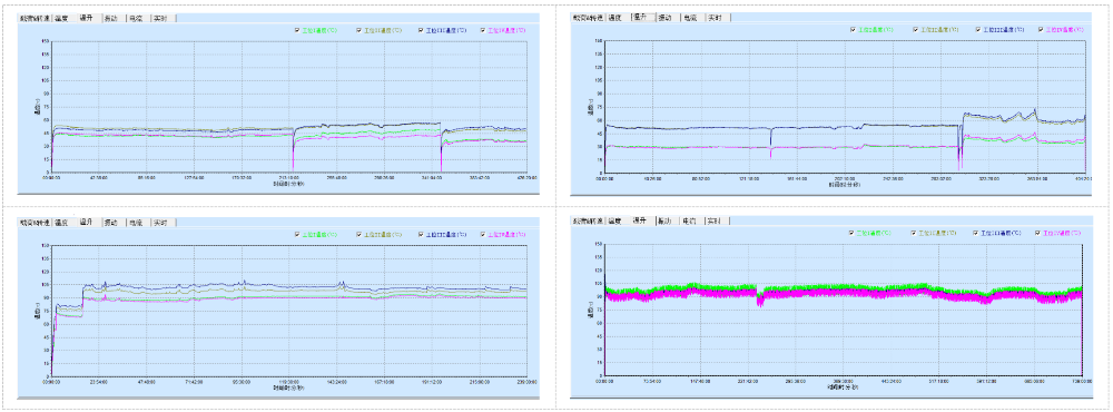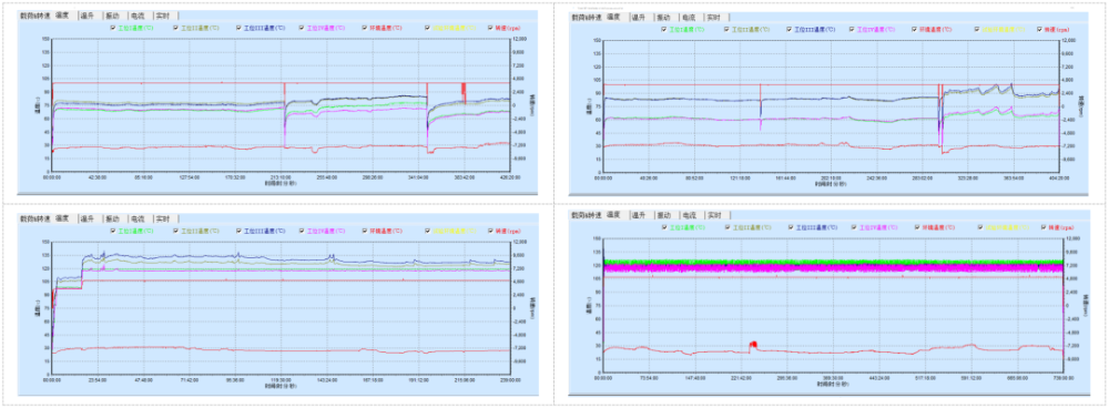 在測(cè)試中,對(duì)每套軸承的溫度、溫升進(jìn)行逐一監(jiān)控,進(jìn)行詳細(xì)記錄每套軸承在每個(gè)時(shí)間點(diǎn)的溫度狀況,對(duì)整個(gè)測(cè)試的溫度變化形成趨勢(shì),是否形成異常高溫等;
