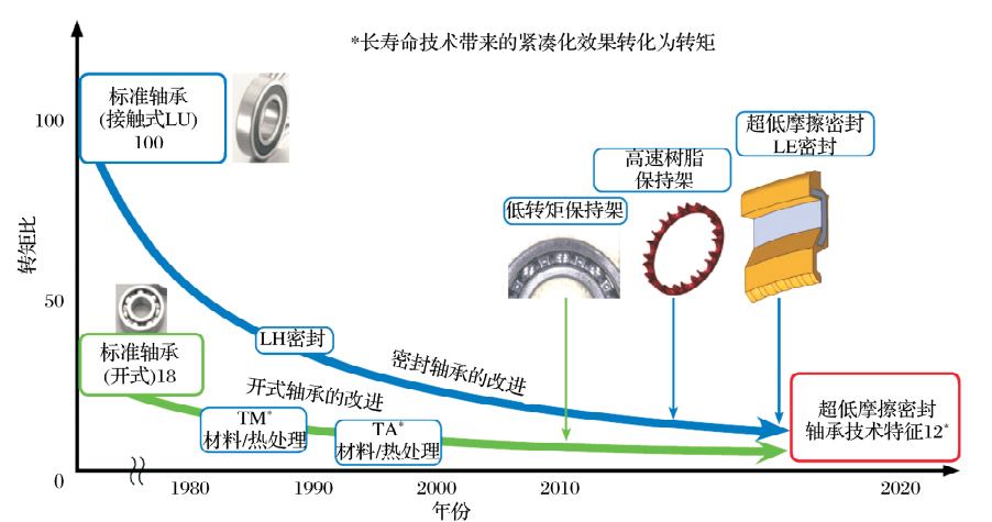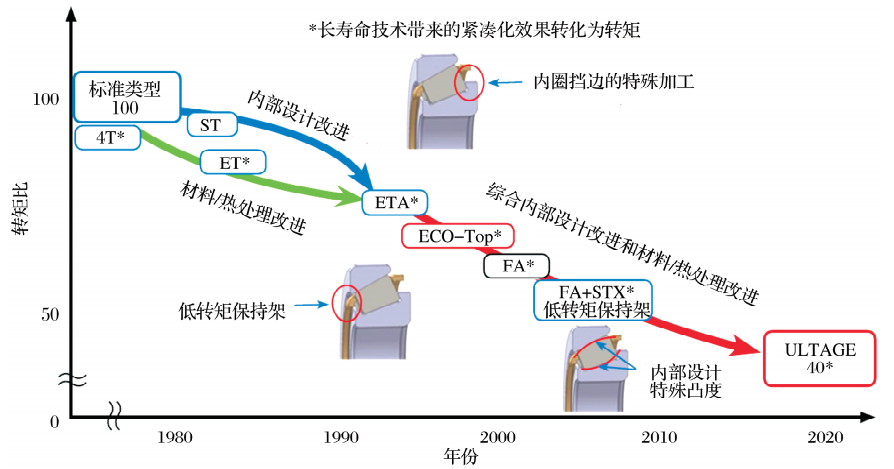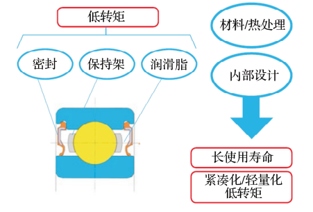 通過材料、熱處理、內(nèi)部設(shè)計參數(shù)的變化以及諸如密封、保持架、潤滑脂的改進(jìn)(圖1),實現(xiàn)低轉(zhuǎn)矩的要求和緊湊化、輕量化的設(shè)計。