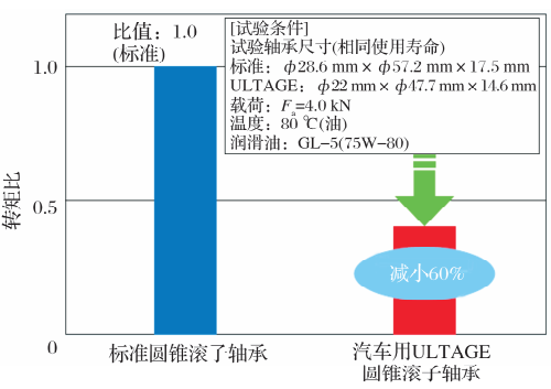 此外,基于全球可采購到的軸承鋼,開發(fā)了長壽命熱處理“FA工藝”。與標(biāo)準(zhǔn)系列相比,ULTAGE圓錐滾子軸承實現(xiàn)了更長的使用壽命和顯著減小的轉(zhuǎn)矩(圖4)。如稍后提到的接觸應(yīng)力分布優(yōu)化等改進(jìn),有助于延長壽命。