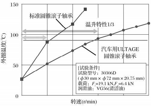 在溫升試驗中,其溫升為標(biāo)準(zhǔn)軸承的1/3,證實了其優(yōu)越的卡死抗力,如圖10所示。如圖7所示,優(yōu)化了擋邊和滾子端面形狀,得到了優(yōu)越的卡死抗力。